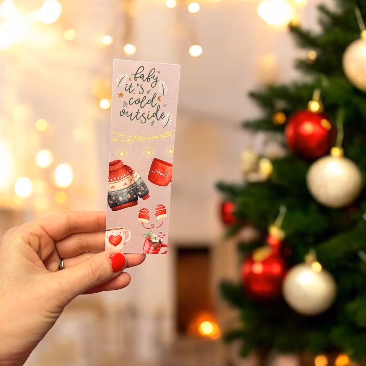 Baby it's cold outside, ett passande tryck för dig som älskar att läsa i värmen under de kyliga månaderna! Här hittar du ett av våra fina bokmärke i papper med passande tryck på. Pappersbokmärke med snyggt tryck på båda sidor som går ton i ton. Ett snyggt och vintrigt bokmärke till dig som gärna matchar boken med vädret! Antingen till dig eller till någon bokälskande vän.