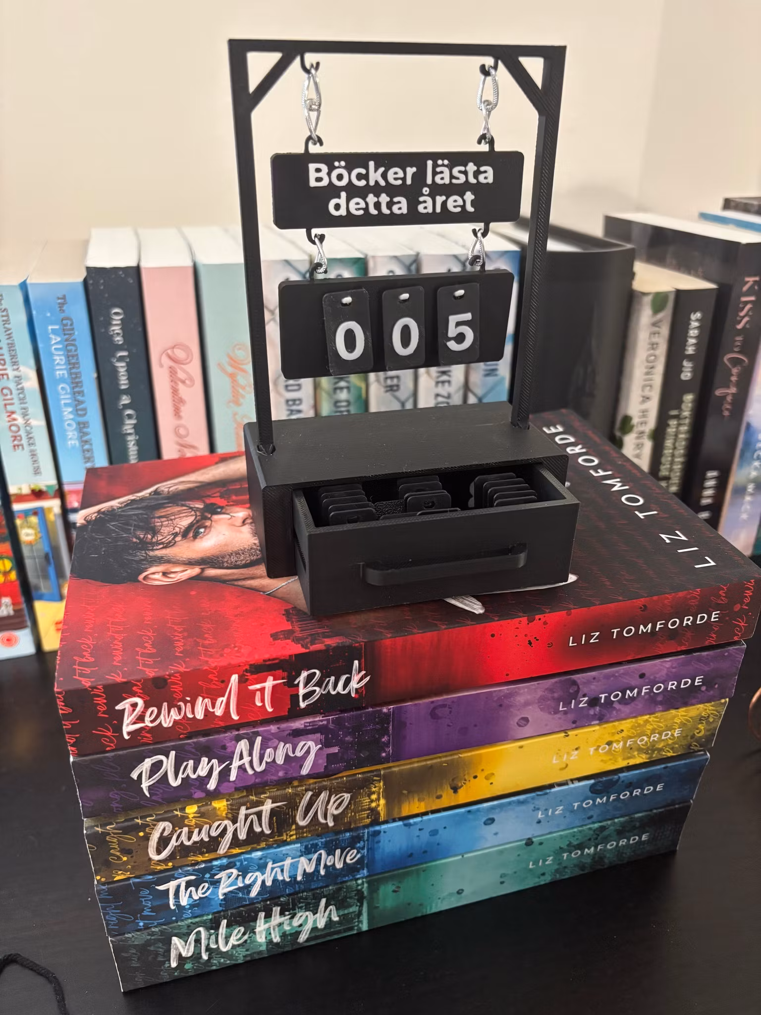 Glöm anteckningsblock och bortglömda listor. Med vår svensktillverkade, 3D‑printade lästracker blir dina läsmål något du faktiskt kan se – varje dag. Det är en vacker, fysisk skylt där du enkelt byter ut siffrorna när du läst fler böcker. En liten ritual som gör läsningen mer motiverande och rolig. I lådan finns fler siffror som du enkelt byter när du avslutat ännu en bok. Du sätter själv ihop kedjorna och kan välja om du vill ha silver eller guldkedjor. I framtiden kommer du också kunna köpa skylten på svenska och då kan du enkelt byta ut den.